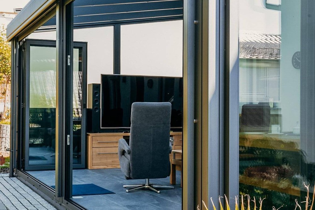 Zasklení s dvojskly a hliníkovou konstrukcí zajišťuje odolnost vůči povětrnostním vlivům a vytváří chráněný prostor pro celoroční využití.