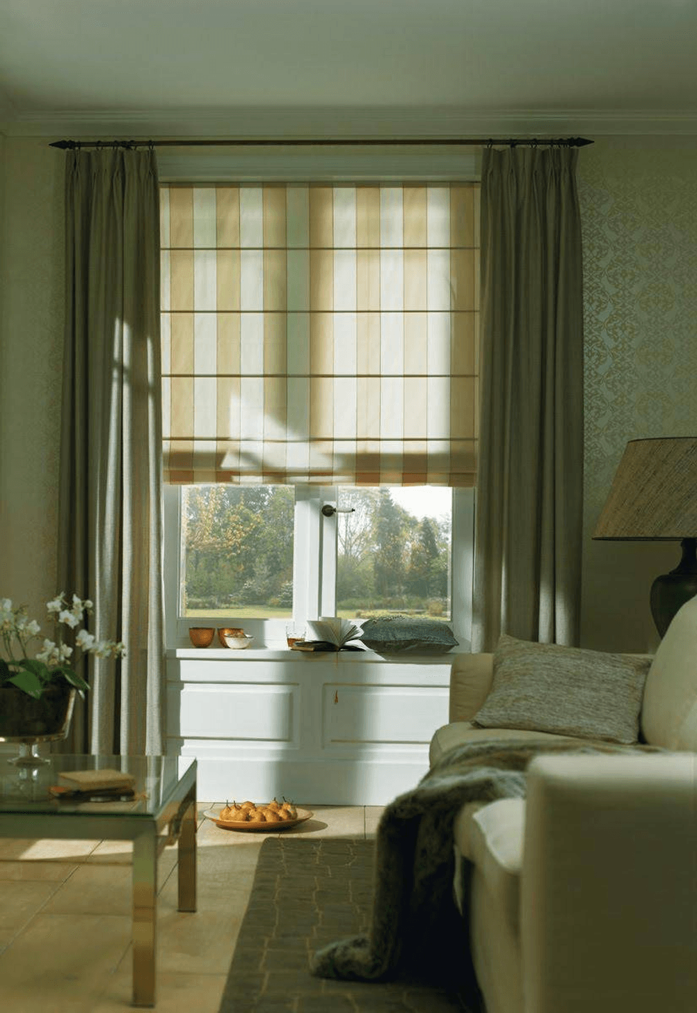 Klasická látková roleta na míru se navíjí a roluje, ale římská roleta se skládá a řasí nahoru. Interiér tak získává eleganci a styl.